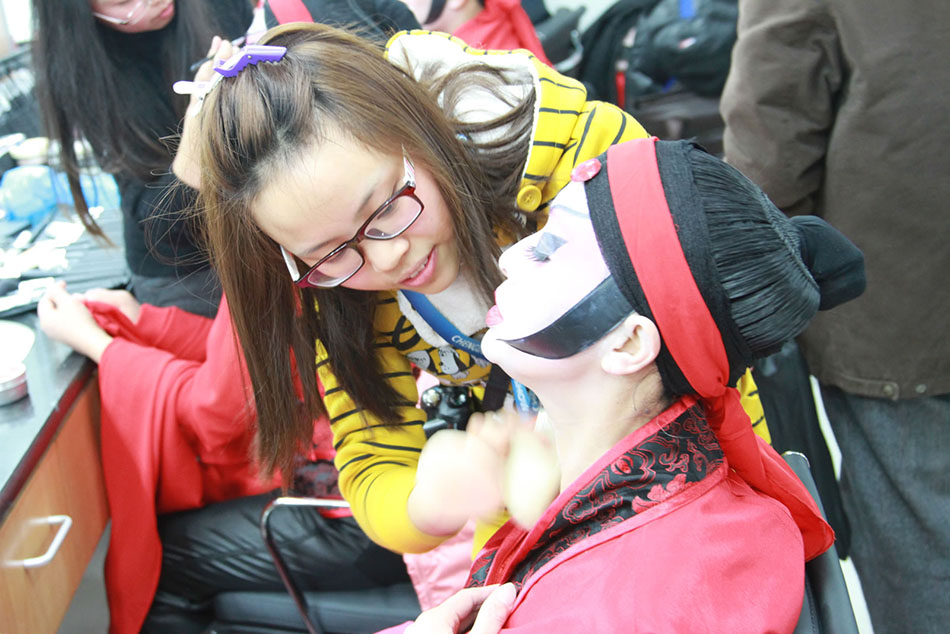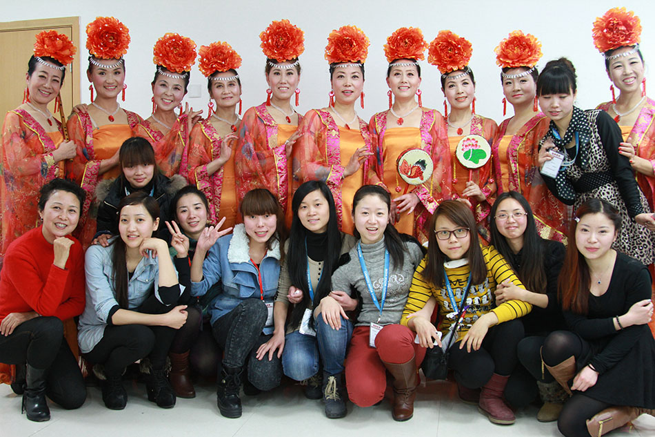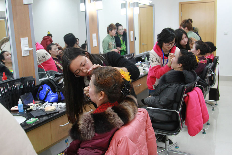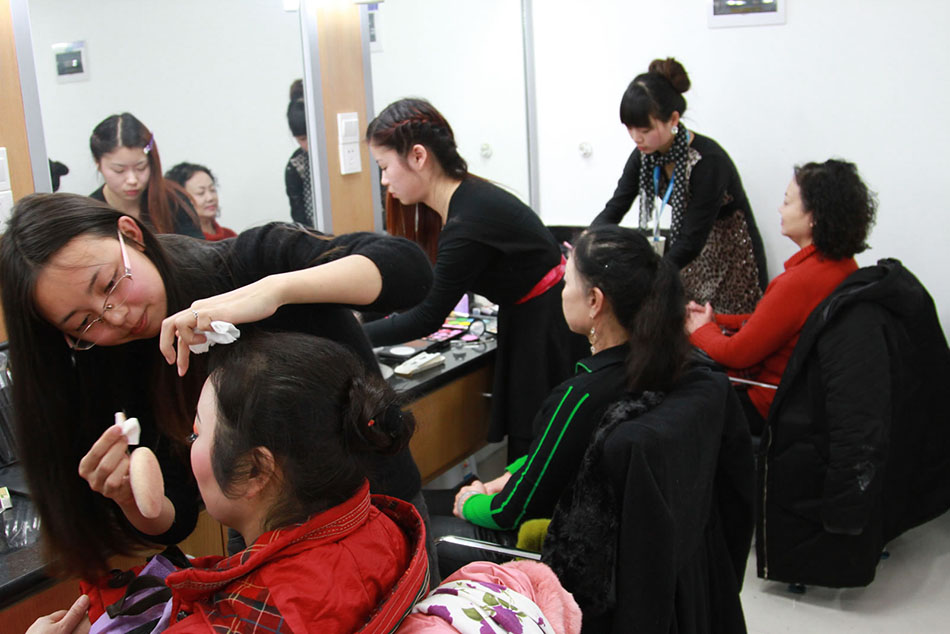 为迎接十八大胜利召开,省广播电视台与市文化局联合举办2012“文化四季风·劲舞暖冬”暨汤臣倍健“耀舞扬威”大型电视群众舞蹈竞技秀系列文化活动。省电视台委托长期合作伙伴成美教育化妆学校为本次比赛演员作整体化妆造型。同学们为各组比赛演员根据她们演出节目及服装服饰搭配出相应的色彩妆面及发型。同学们每天需要为10多个演出团队200多名演员化妆造型。同学们出色的完成了此次任务,受到了各位演员及电视台工作人员及广大观众的好评。下面就让大家看看我们在现场拍回的一些照片吧。